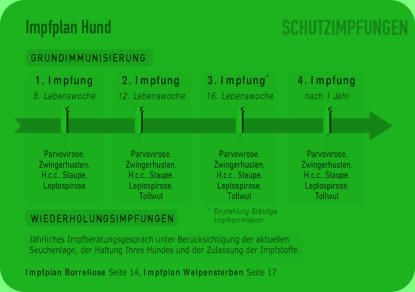 Infektionskrankheiten vorbeugenab 8 WochenImpfung gegen Staupe (S), Hepatitis (H), Parvovirose (P), Parainfluenza(Pi), Leptospirose (L)ab 12 WochenImpfung gegen Staupe (S), Hepatitis (H), Parvovirose (P), Parainfluenza(Pi), Leptospirose (L) und Tollwut (T)ab 16 Wochen(Stlko Vet. Impfempfehlungen)Impfung gegen Staupe (S), Hepatitis (H), Parvovirose (P), Parainfluenza(Pi), Leptospirose (L) und Tollwut (T)Bitte beachten Sie die jährliche Auffrischung!StaupeDie Hunde-Staupe ist bereits seit dem 18. Jahrhundert bekannt. Der Erreger der Hunde-Staupe ist ein Virus. In Deutschland ist die Staupe dank der regelmäßig bei Hunden durchgeführten Impfungen selten geworden.Doch vereinzelt treten immer wieder Erkrankungsfälle auf, meist bei ungeimpften Hunden. Die Ansteckung durch das Staupe-Virus erfolgt über Mund oder Nase des Hundes. Nach drei bis sechs Tagen kann dann Fieber auftreten. Später greift das Staupe-Virus verschiedene Organe im Körper des Hundes an. Dazu gehören der Verdauungs- und der Atmungsapparat, die Augen, die Haut und das Nervensystem.HepatitisDie ansteckende Leberentzündung tritt nur noch selten auf, weil die meisten Hunde regelmäßig durch eine Impfung geschützt werden. Das Virus wird nicht nur von Hund zu Hund durch Speichel, Harn oder Kot übertragen, sondern auch indirekt durch den Kontakt mit infizierten Gegenständen. Die Hunde können manchmal innerhalb weniger Stunden sterben, ohne dass der Tierhalter vorher etwas bemerkt hat. Symptome der Erkrankung sind Fieber, Mandelentzündung mit Lymphknotenschwellung, starke Bauchschmerzen, Lungenentzündung und Störung des zentralen Nervensystems. In der Heilungsphase können graue Hornhauttrübungen auftreten.LeptospiroseDie Erreger der Leptospirose, die Leptospiren (Bakterien), werden von befallenen Hunden oder anderen Tieren (zum Beispiel Ratten) mit dem Harn ausgeschieden und sind besonders in feuchtem Boden und in Gewässern sehr lange lebensfähig. Nicht nur Hunde und andere Tiere können sich anstecken, sondern auch der Mensch. Deshalb zählt man die Leptospirose zu den Zoonosen (Krankheiten und Infektionen, die natürlicherweise zwischen Wirbeltieren und Menschen übertragen werden).Die Leptospiren werden über die Schleimhäute des Verdauungsapparates aufgenommen und können sowohl leichte, fiebrige Erkrankungen als auch schwerste, bis zum Tode führende Leber- und Nierenschäden hervorrufen. Die regelmäßige Impfung schützt nicht nur den Hund selbst, sondern auch die Menschen, die mit ihm zusammenleben, vor einer durch den Hund übertragenen Leptospireninfektion.ParvoviroseUrsache und Übertragung:Die Parvovirose des Hundes wurde im Jahr 1978 fast gleichzeitig in Europa, Nordamerika und Australien entdeckt. Der Erreger, das Parvo-Virus, wird von erkrankten Tieren massenhaft mit dem Kot ausgeschieden und ist in der Außenwelt sehr lange lebensfähig. Typische Ansteckungsquellen sind mit Kot beschmutztes Futter, Gegenstände und Kleider. Das Parvo-Virus wird über den Mund aufgenommen und siedelt sich in der Dünndarmschleimhaut an.Krankheitsanzeichen:7 bis 14 Tage nach der Aufnahme des Virus können die ersten Krankheitsanzeichen auftreten. Die auffallendsten Symptome, wässrig bis blutiger, stinkender Durchfall und Erbrechen, sind die Folgen einer Zerstörung der Darmschleimhaut durch das Parvo-Virus. Die erkrankten Tiere trocknen schnell aus, viele müssen trotz intensivster tierärztlicher Bemühungen sterben.Vorbeugung:In den ersten Jahren hat man Hunde mit dem für Katzen bestimmten Katzenseuchen-Impfstoff geimpft. Das war möglich, weil der Erreger der Katzenseuche mit dem Parvo-Virus des Hundes verwandt ist. Daher kommt auch die frühere Bezeichnung „Katzenseuche des Hundes“ für die Parvovirose. Inzwischen gibt es spezielle Impfstoffe für den Hund. Rechtzeitige Impfungen bieten einen guten Schutz gegen die Infektion mit dem Parvo-Virus. Die Erkrankungshäufigkeit ist zwar nicht mehr so groß wie zu Beginn der 80er-Jahre, trotzdem infizieren sich immer noch viele Hunde. Durch einen Schnelltest kann das Parvo-Virus in einer Stuhlprobe sicher nachgewiesen werden.Wenn sich der Schlendrian im Zusammenhang mit der Parvovirose-Schutzimpfung breit macht, führt das häufig zu bösen Überraschungen. Bitte fragen Sie Ihre Tierärztin/Ihren Tierarzt, zu welchem Zeitpunkt die Impfungen erfolgen sollten, um optimalen Schutz zu gewähren.TollwutUrsache und Übertragung:Eine der gefährlichsten Krankheiten für Mensch und Tier ist die Tollwut. Dank der Impfung von Haustieren und Füchsen ist es gelungen, die bis heute unheilbare Tollwut stark einzudämmen. Sie kommt aber immer noch gelegentlich vor. Hunde und Katzen können durch den Kontakt mit Wildtieren, hauptsächlich mit Füchsen, angesteckt werden. Mit dem Speichel oder beim Biss wird das Virus übertragen.Krankheitsanzeichen:Früher kam es zu dem typischen Krankheitsverlauf bei den Hunden, die sich „wie toll“ benahmen. Heute sehen die Symptome häufig anders aus. Infizierte Tiere verhalten sich über eine längere Zeit fast normal, sind ruhig und unauffällig. Dieser äußere Eindruck täuscht. Tollwutinfizierte Tiere sind äußerst gefährlich und der Umgang mit ihnen ist auf jeden Fall zu vermeiden.Erst nach Wochen und Monaten nach der Ansteckung kann es zu klinischen Symptomen kommen, die mit Juckreiz, Speichelfluss, Unruhe und Beißwut auf Tollwut hinweisen können.Vorbeugung:Die einzige Maßnahme, die unseren Hund vor einer Tollwuterkrankung sicher schützt, ist die vorbeugende Impfung. Denken Sie bitte auf jeden Fall daran: Eine Auslandsreise ist ohne EU-Reisepass mit Impfnachweis gegen Tollwut nicht möglich.ZwingerhustenUrsache und Übertragung:Anders als der Name vielleicht fälschlich vermuten lässt, können nicht nur im Zwinger gehaltene, sondern auch in Wohnungen lebende Hunde an Zwingerhusten erkranken. Als Erreger des Zwingerhustens kommen gleich eine ganze Reihe verschiedener Viren und Bakterien in Frage.Die Ansteckung erfolgt über 